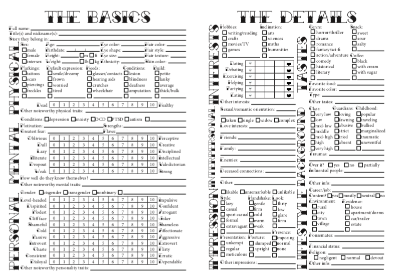 Welcome to the printer-friendly, form-fillable, better-designed version of the No-Effort Character Sheet For Lazy Writers Like You And Me! This worksheet got over 80k notes on tumblr on first release, and now it's here, new and improved! As always, it's completely free, but if you're feeling generous you could leave a little donation! Print, copy, and fill in however many you'd like! Just make sure to leave the credit in there ;)